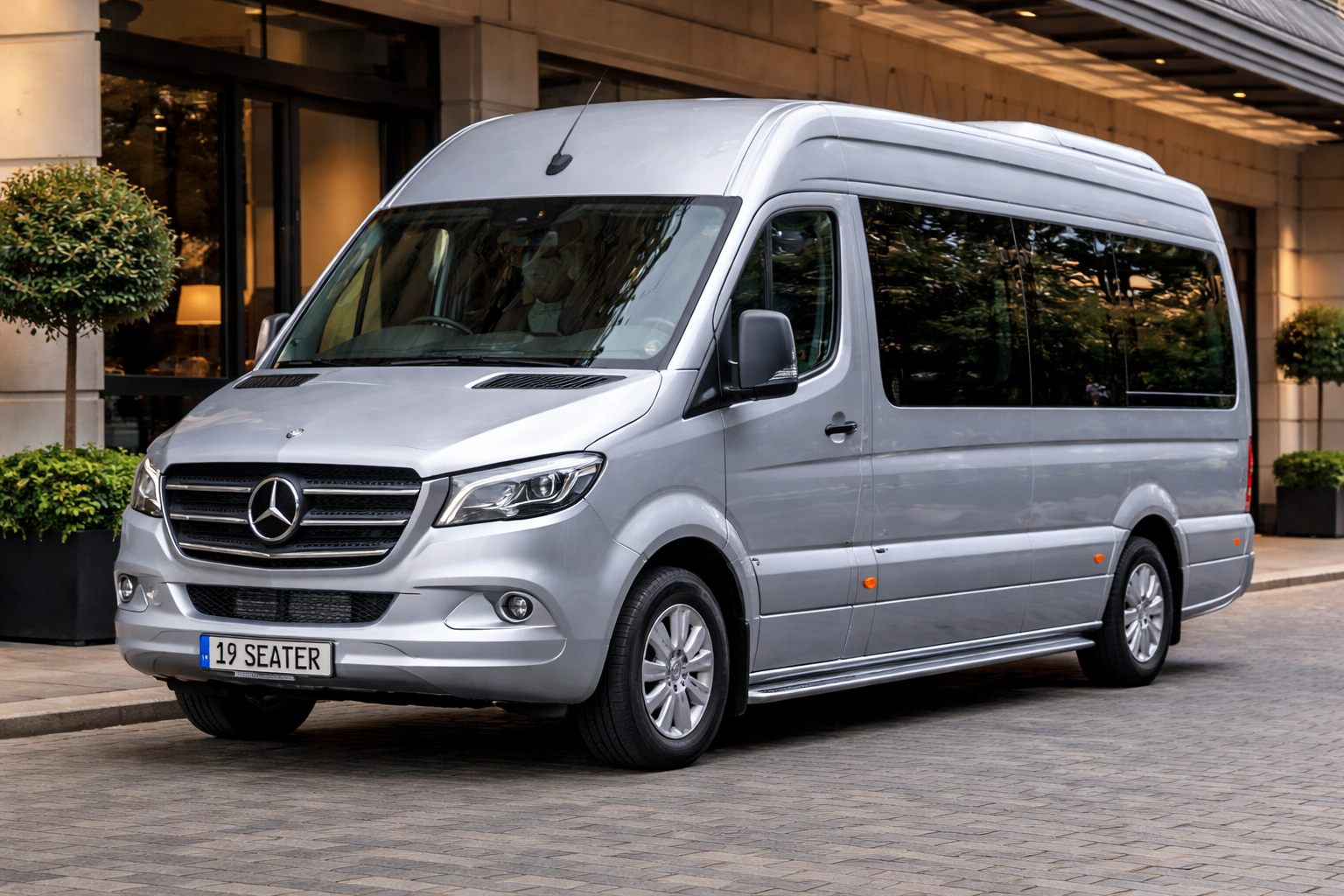 Travel in superior comfort with the Mercedes Sprinter 19-seater, featuring spacious seating, generous luggage capacity, and modern amenities, perfect for mid-size groups seeking reliable and comfortable transfer experiences.